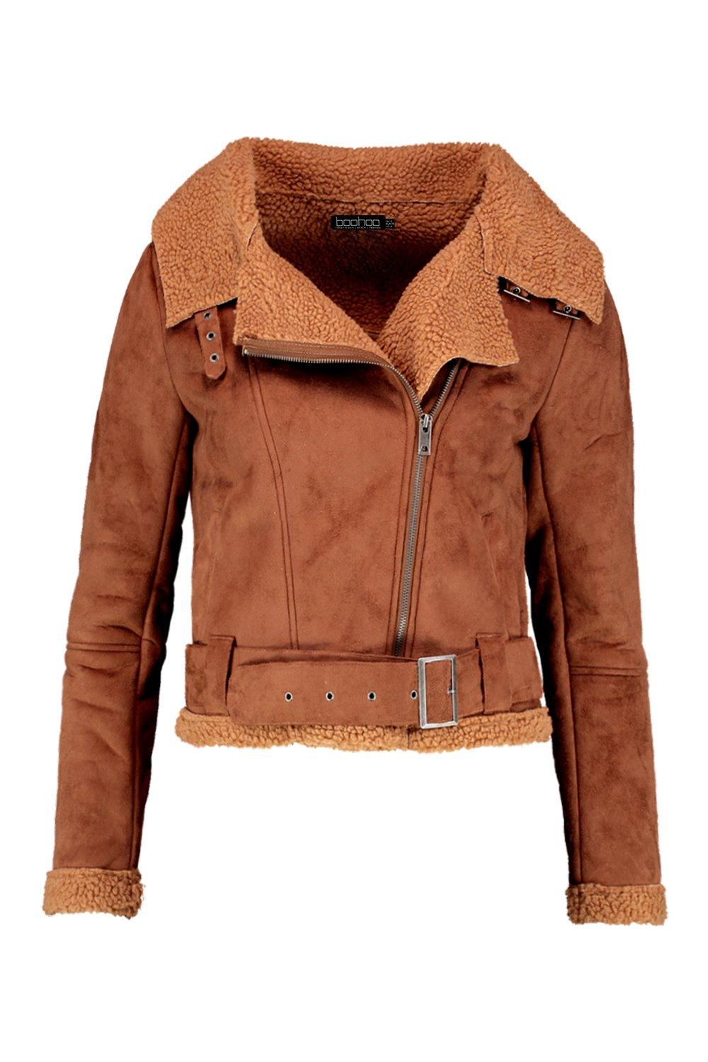 Women s Contrast Teddy Trim Tan Aviator Boohoo UK Very well made.
