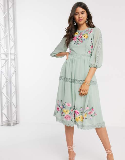 ASOS DESIGN embroidered midi skater dress with lace trims and puff sleeves in sage green Very well made.