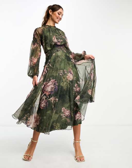 ASOS DESIGN long sleeve lace insert skater midi dress in green floral print Very well made.